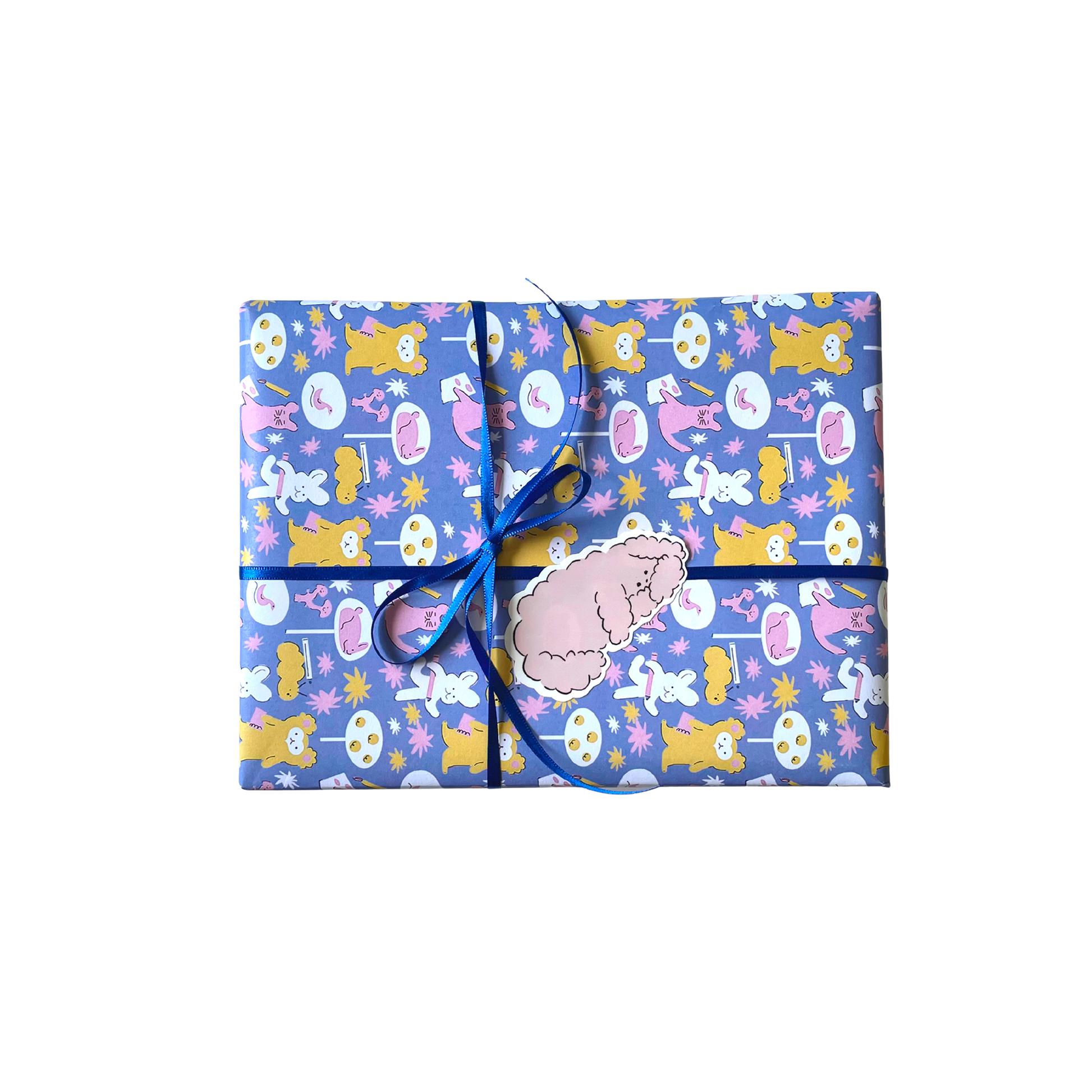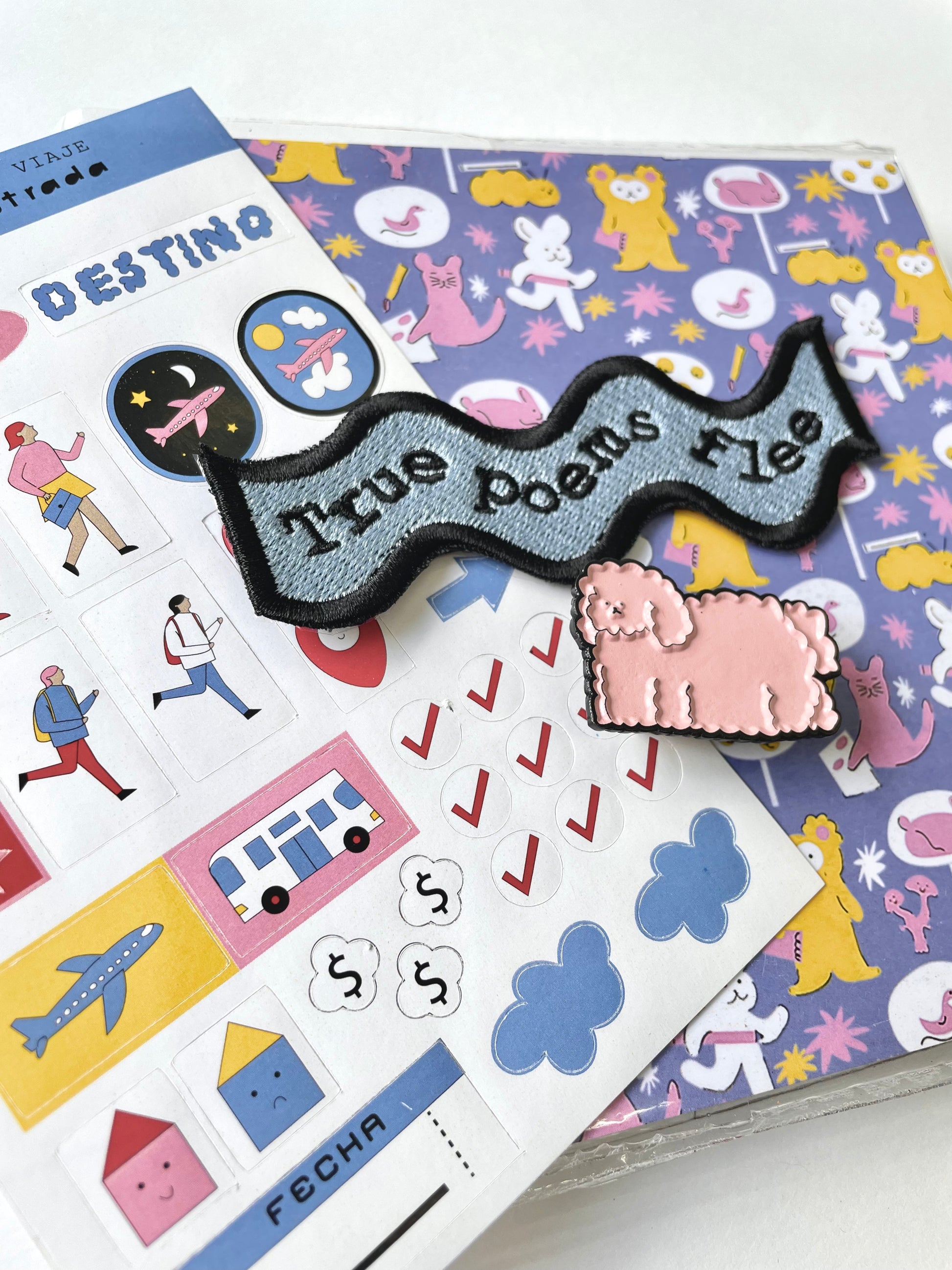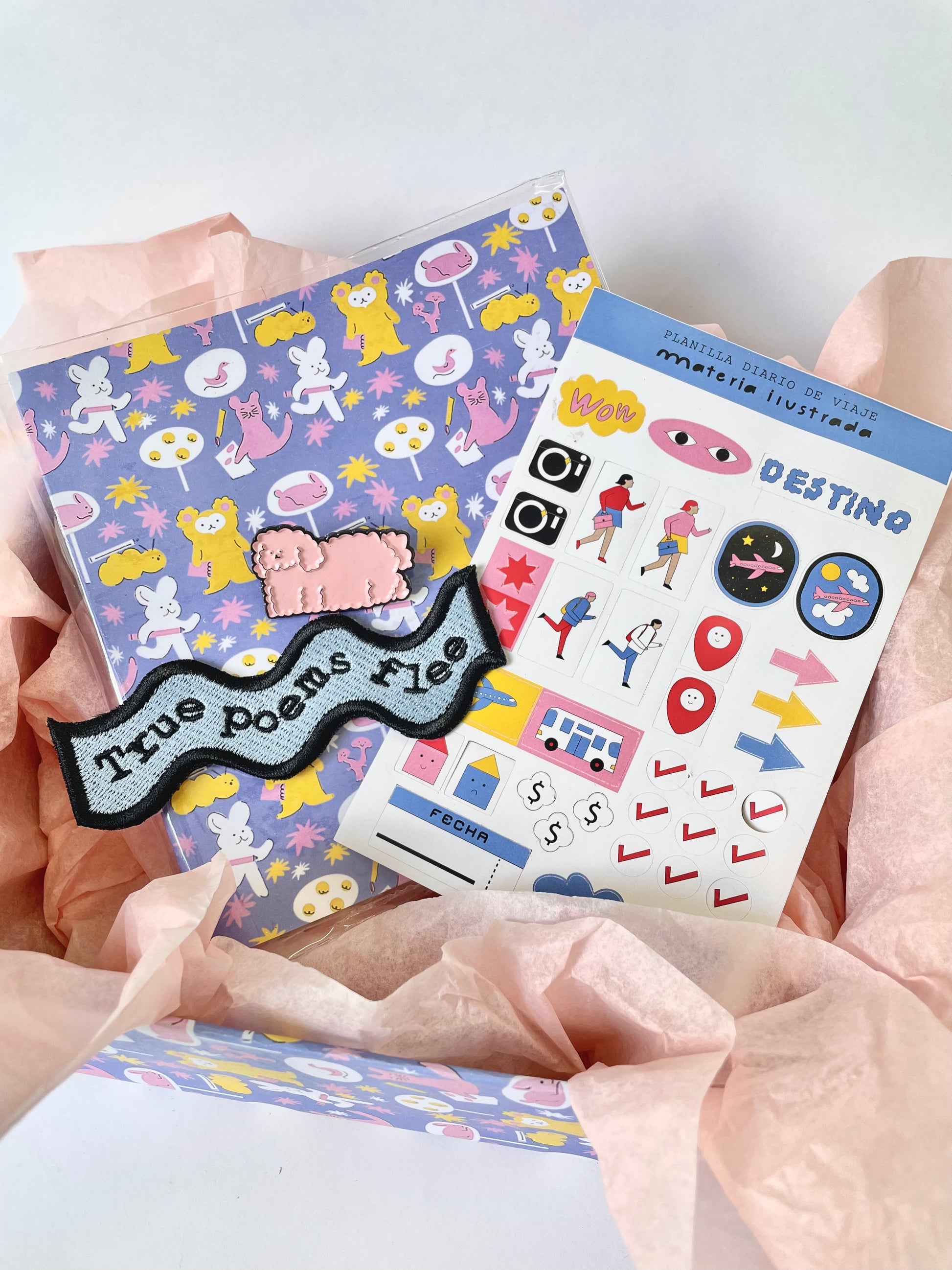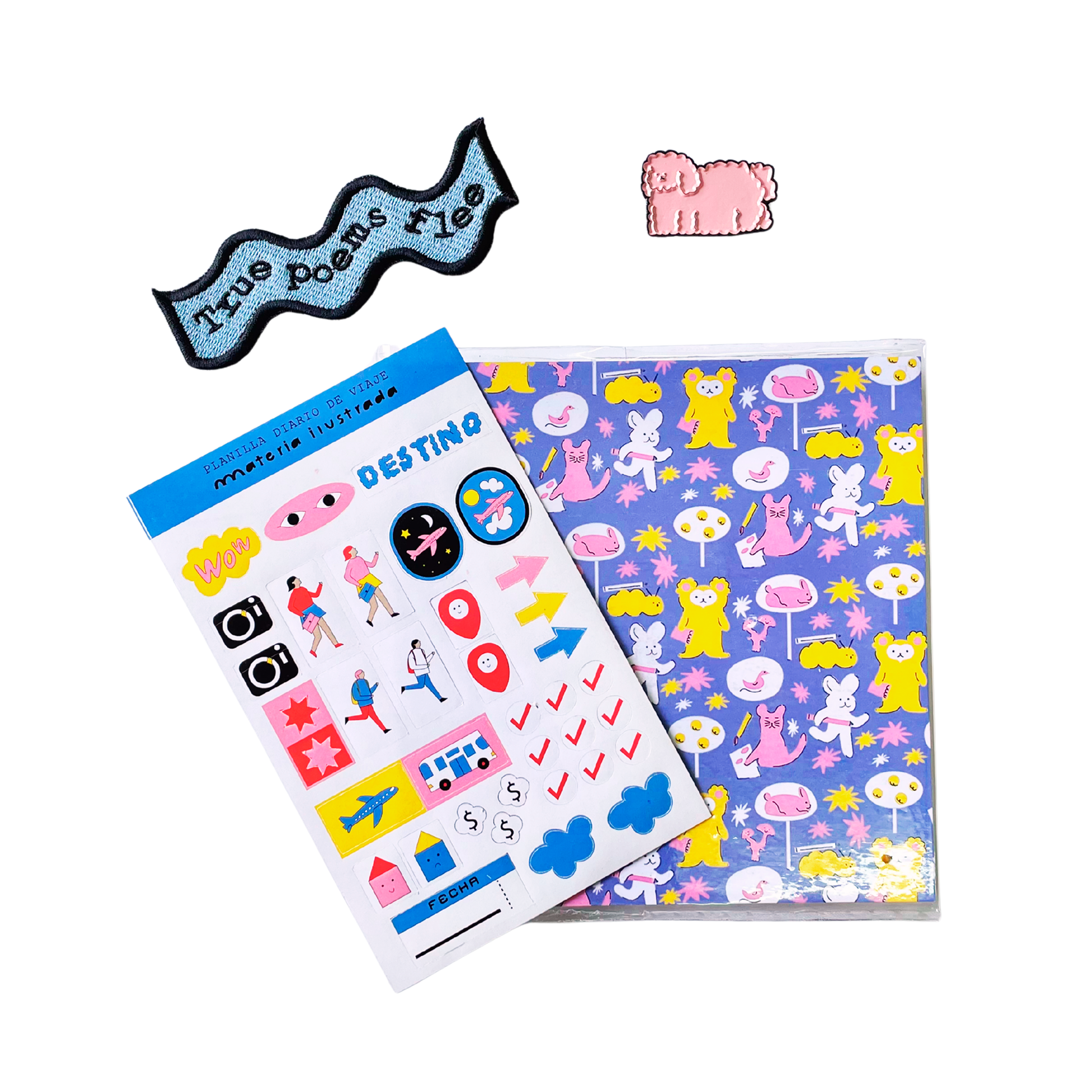 Paquete de planillas para viajeros, un parche, un pin metálico de perrito y una libreta. Todo va empacado en el bonito papel estampado Nostalgia.